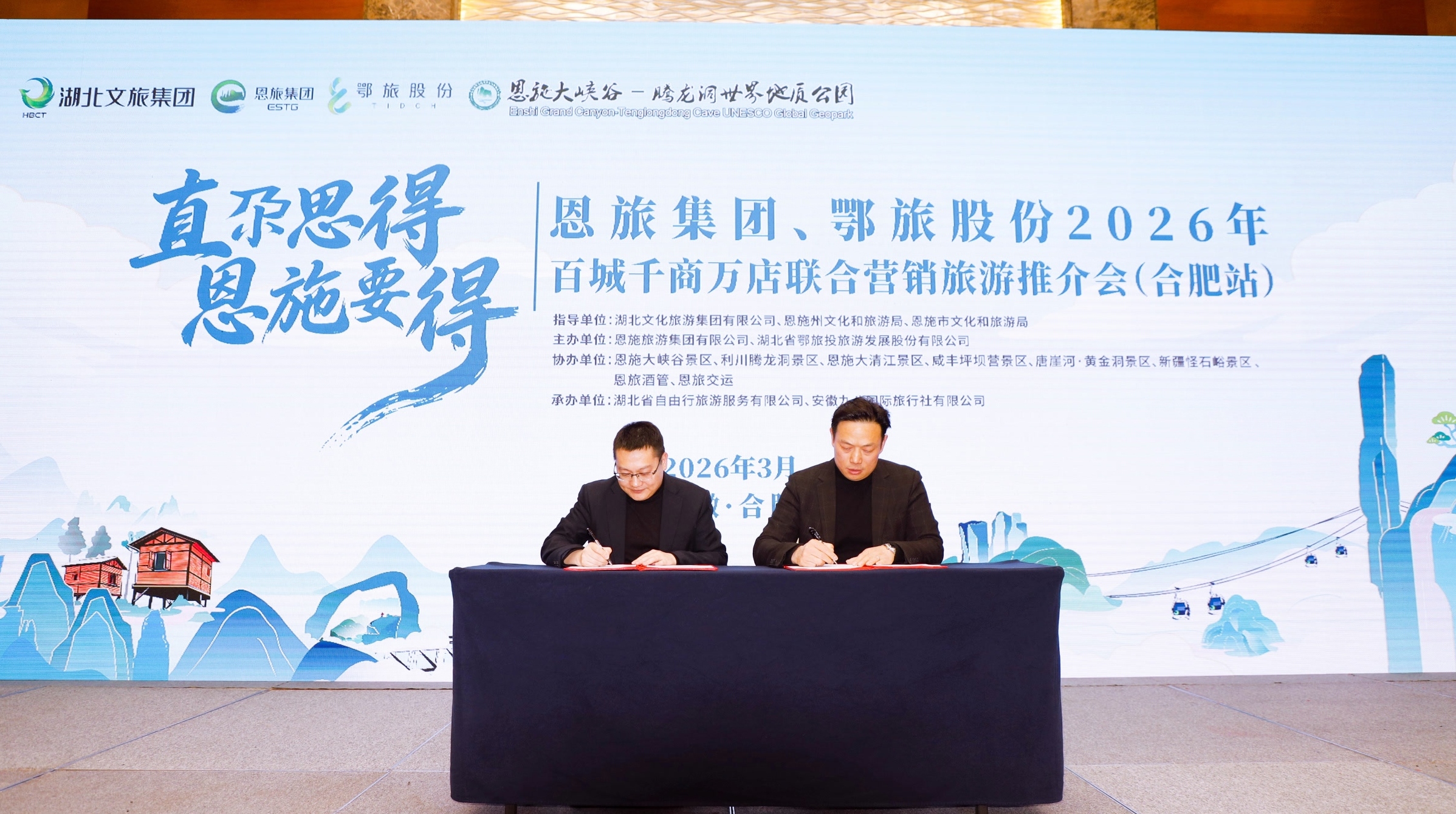 簽約儀式上,恩旅集團(tuán)與安徽渠道伙伴簽署合作協(xié)議。與會渠道商表示,2026年將積極組織安徽游客赴恩施旅游,感受夏日清涼,體驗土家摔碗酒等民俗文化,領(lǐng)略恩施山水風(fēng)光。