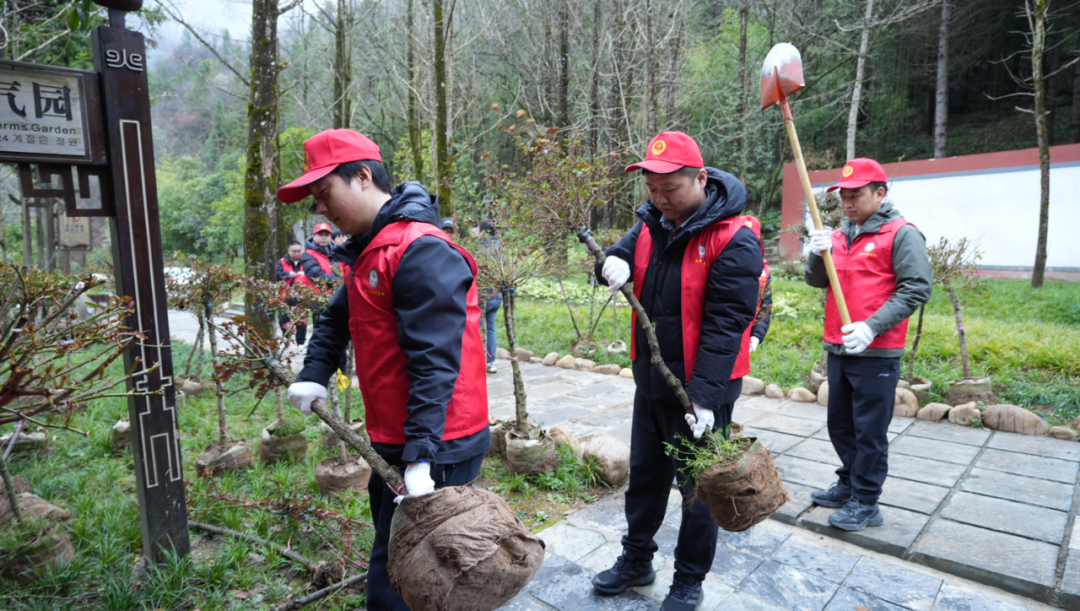 3月16日上午8:30,神農(nóng)壇景區(qū)薄霧未散。來自本部各部門40余名志愿者乘坐大巴來到神農(nóng)壇景區(qū),他們和景區(qū)28名志愿者一起,在本部黨支部書記張文同志的組織下,身著紅馬甲、戴上白手套,扛起鐵鍬、鋤頭,提著月季樹苗,精神抖擻地走進(jìn)節(jié)氣園種植區(qū)。