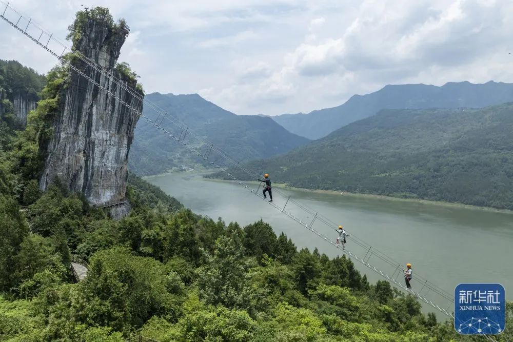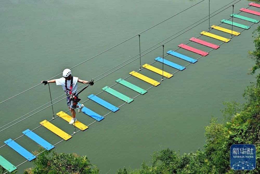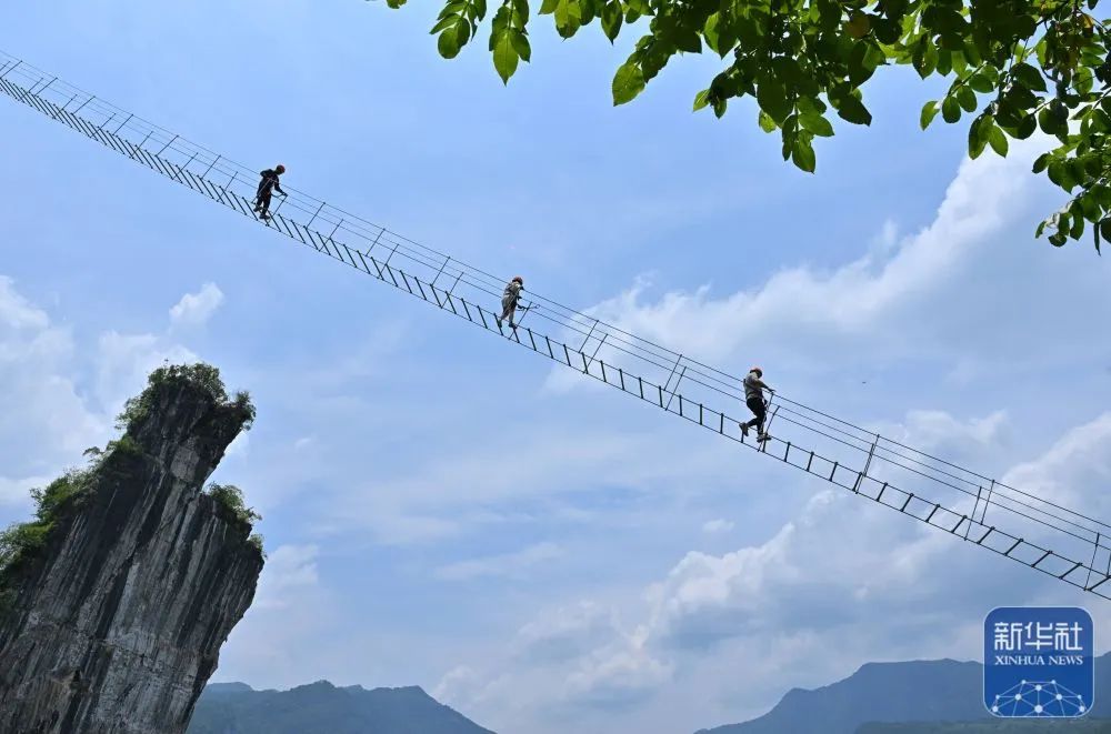 湖北省恩施市新塘鄉(xiāng)紅花峰林景區(qū),游客在體驗(yàn)“彩橋”項(xiàng)目新華社發(fā)(宋文攝)