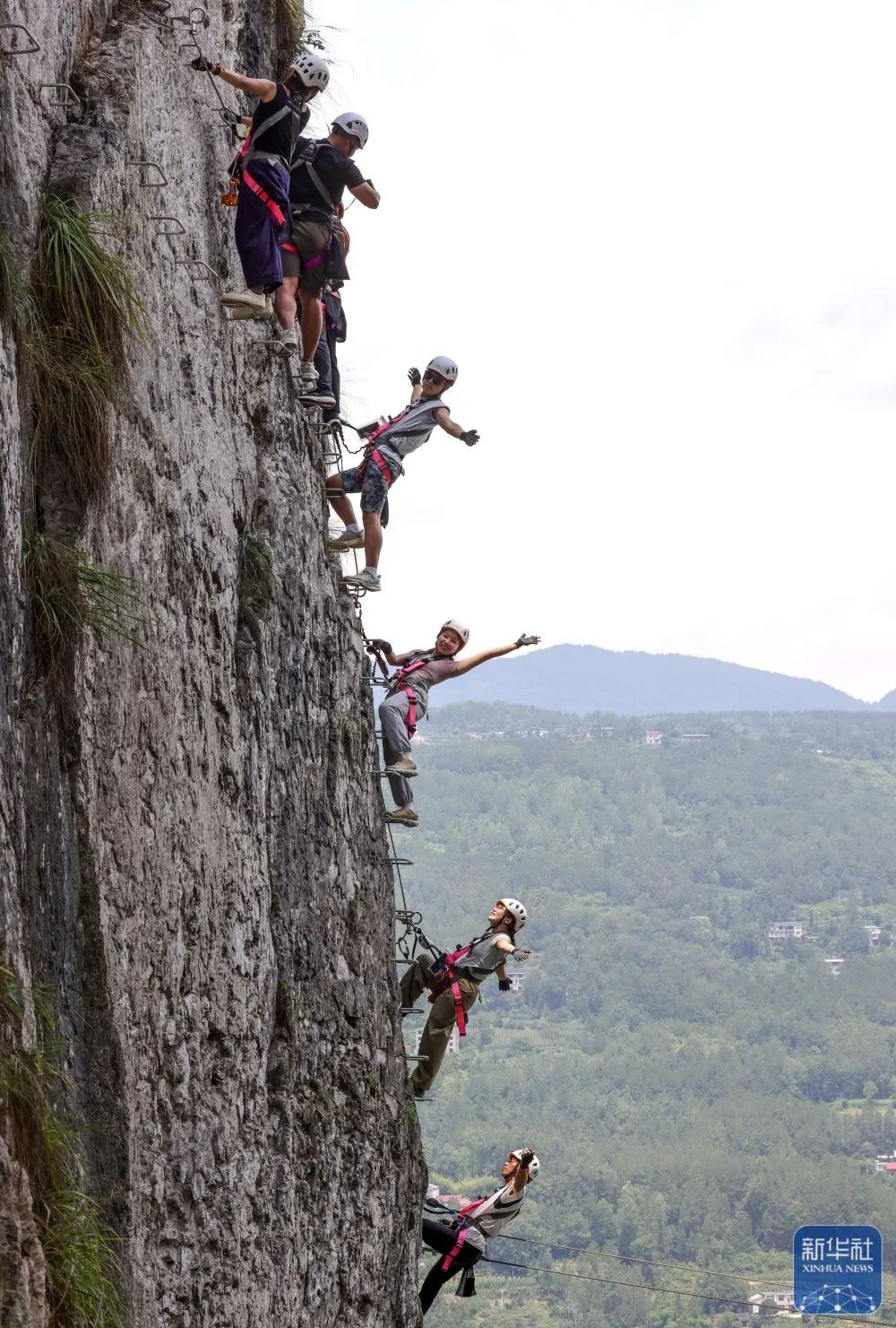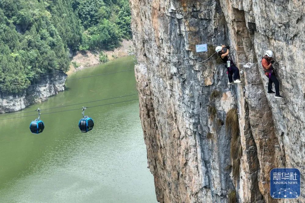 湖北省恩施市新塘鄉(xiāng)紅花峰林景區(qū),游客在體驗(yàn)“飛拉達(dá)”攀巖項(xiàng)目。新華社記者 (伍志尊攝)