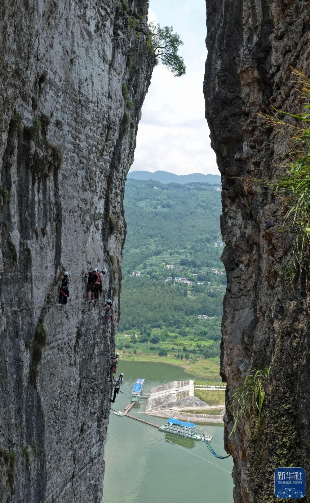湖北省恩施市新塘鄉(xiāng)紅花峰林景區(qū),游客在體驗(yàn)“天梯”項(xiàng)目。新華社記者( 伍志尊 攝)
