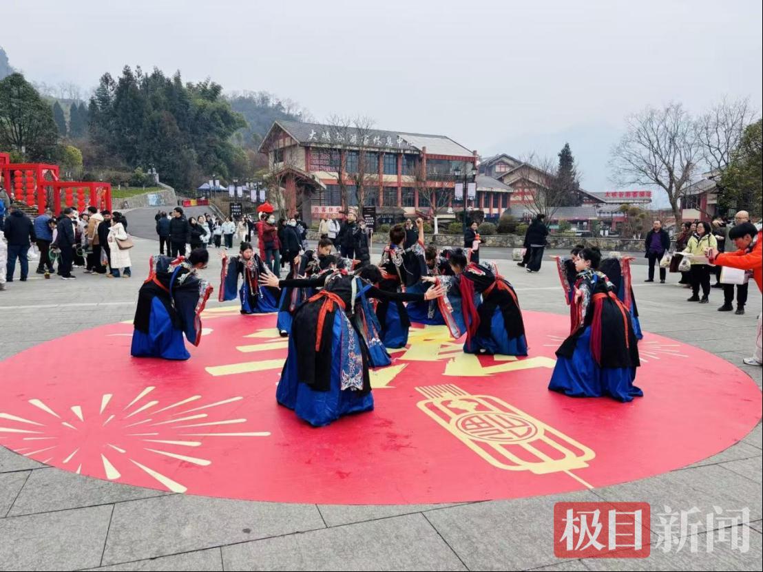作為整場活動的核心,“祈福運”環(huán)節(jié)更是將文化厚重感推向高潮。千年非遺儺舞復(fù)原表演驚艷亮相,儺面舞者們以古樸蒼勁的肢體語言,演繹著土家先民驅(qū)邪納福、祈愿安康的古老傳統(tǒng),盡顯非遺文化的莊嚴與神圣。隨后,悠揚古樂響起,莊重的祈福詞恭讀儀式舉行,聲聲祝愿響徹峽谷:一祈國泰民安,二祈身體健康,三祈事業(yè)騰飛,四祈福壽綿長,將最真摯的新春期許送給了現(xiàn)場每一個人。
