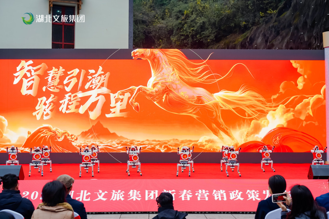 發(fā)布會伊始,鄂旅股份酷馳科技的機器狗團隊成為全場焦點。這些靈巧的智能設(shè)備身著特制馬年“新春限定皮膚”,化身吉祥的“機器馬”,在會場入口分列兩隊賽博迎賓,巧妙烘托出農(nóng)歷馬年的喜慶主題與科技氛圍。