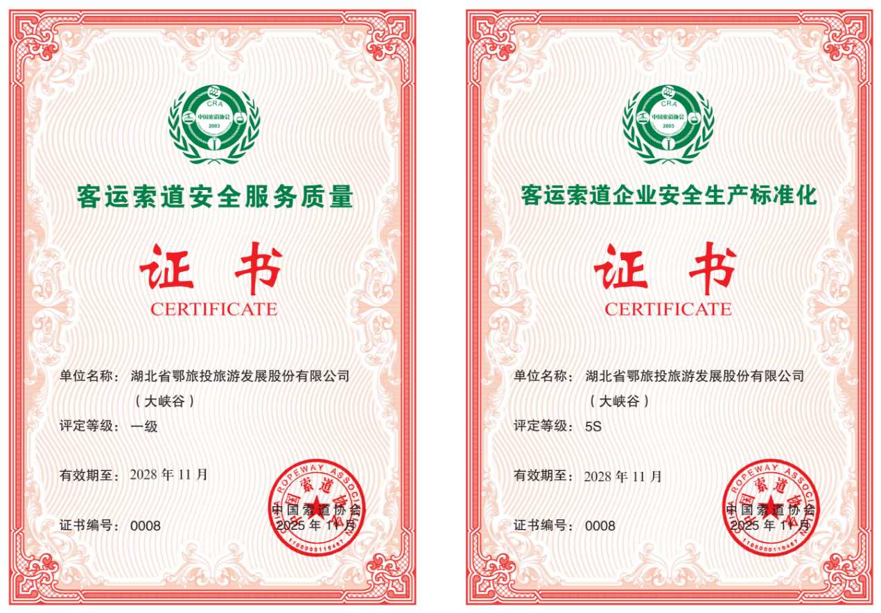 近日,中國索道協(xié)會正式發(fā)布《關于公布2025年客運索道安全服務質量和安全生產標準化企業(yè)評審結果的通知》。湖北省鄂旅投旅游發(fā)展股份有限公司旗下地面纜車與大峽谷索道項目雙雙脫穎而出,均獲評“一級5S”標準化企業(yè),彰顯了公司在客運索道安全運營與服務品質方面的行業(yè)領先地位。