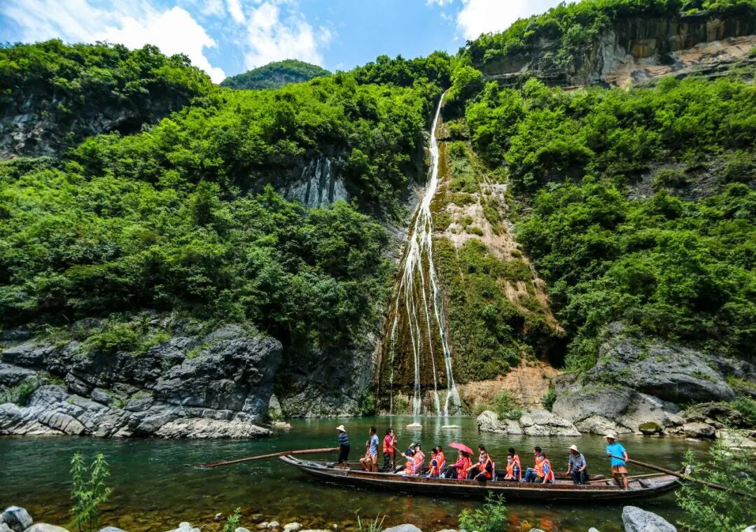 “快看!懸崖上真的有懸棺!”游船剛駛?cè)雿{谷深處,船艙內(nèi)便響起陣陣驚嘆。神農(nóng)溪是國家級(jí)風(fēng)景名勝區(qū)、國家5A級(jí)旅游景區(qū),發(fā)源于“華中屋脊”神農(nóng)架南麓,由北向南穿行于深山絕壁之間,最終匯入長江。兩岸絕壁如削,古棧道遺跡懸于半空,千年懸棺神秘肅穆,碧綠溪水倒映著峰巒疊翠——這幅“山在水中生,人在畫中游”的實(shí)景畫卷,讓地理與歷史課本上的文字瞬間變得觸手可及。