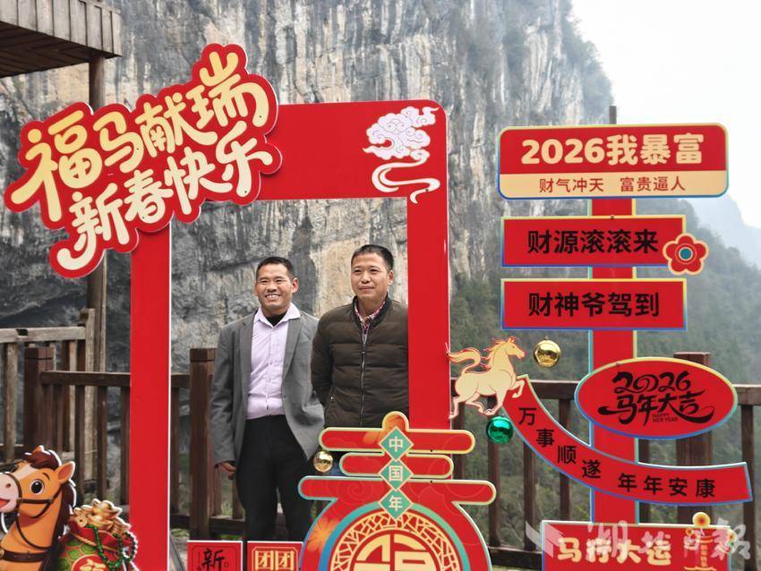 景區(qū)精心設(shè)置的新春打卡區(qū)成為游客們爭相打卡拍照的熱點。紅彤彤的祈福墻上,貼滿了大大小小的“福”字,游客們在這里許下新年的愿望,祈福馬年吉祥如意。打卡墻前,一家老小紛紛合影留念,定格下這個別具一格新春記憶。