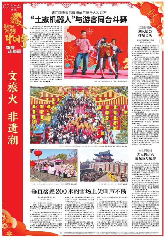 湖北日報訊?。ㄓ浾哧惲x超、通訊員楊金艷)與身著民族服飾的機(jī)器人同臺斗舞,搶繡球、套圈、拓印……2月20日,正月初四,長陽清江畫廊景區(qū)豐富的互動活動讓游客們大呼過癮。當(dāng)天,該景區(qū)接待人次破萬,創(chuàng)春節(jié)假期單日接待量歷史新高。