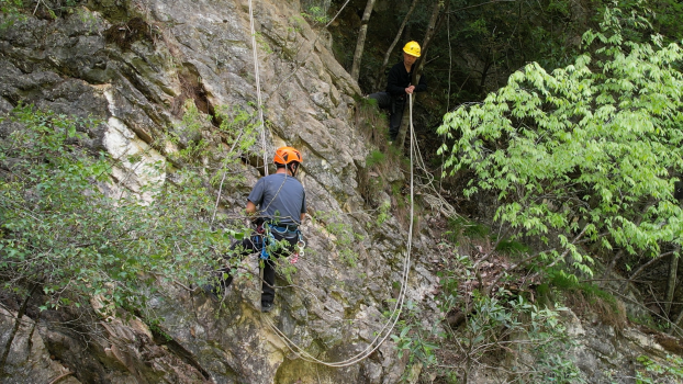 (圖1:景區(qū)安全員正在組織繩降清理危石)