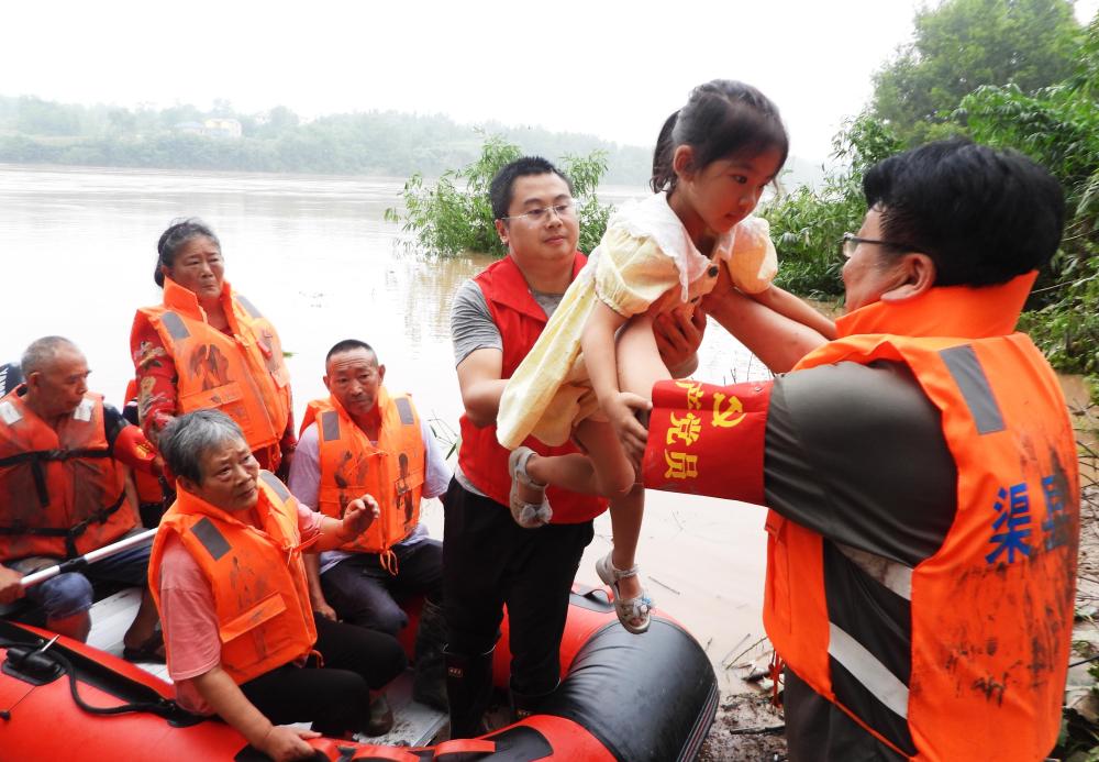 2024年7月12日,在四川省達(dá)州市渠縣李渡鎮(zhèn)燈臺(tái)社區(qū),黨員干部志愿者在洪水中轉(zhuǎn)移被困村民。