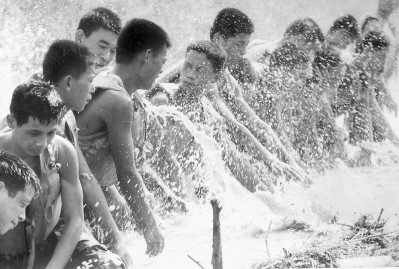 1998年抗洪搶險中,面對洶涌的洪水,戰(zhàn)士們躍入江中,用自己的身體筑成一堵防波堤。新華社記者拍攝/資料圖片